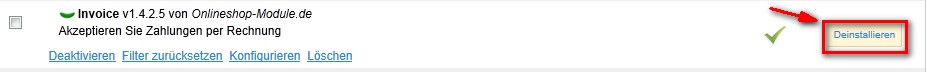 1. Deinstallation des Zahlungsmoduls Rechnung (Back Office > Module > Zahlung > Invoice v1.4.2.5 > Deinstallieren)