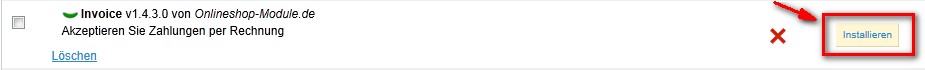 6. Installation des Zahlungsmoduls Rechnung (Back Office > Module > Zahlung > Invoice v1.4.3.0 > Installieren)