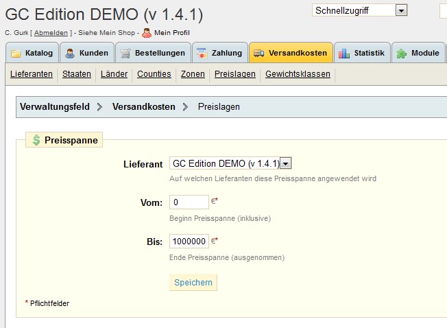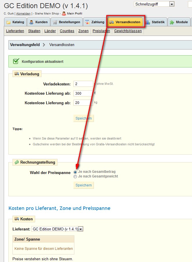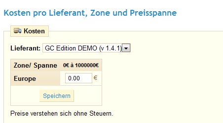 Danach erscheint unter Kosten mit dem Lieferanten die gewünschte Zone/Spanne. Klicken Sie dort nochmal auf Speichern.