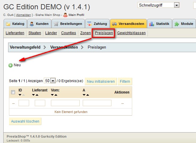Legen Sie unter Versandkosten > Preislagen > Neu eine neue Preislage an.