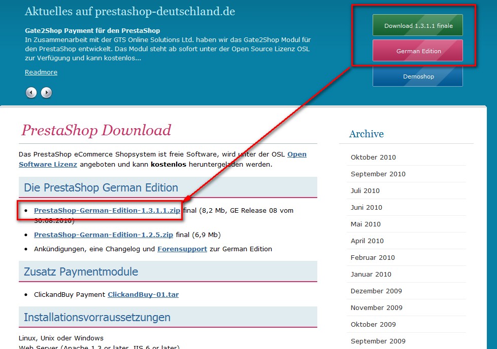 Man gelangt direkt zur Downloadseite unter http://www.prestashop-deutschland.de/download