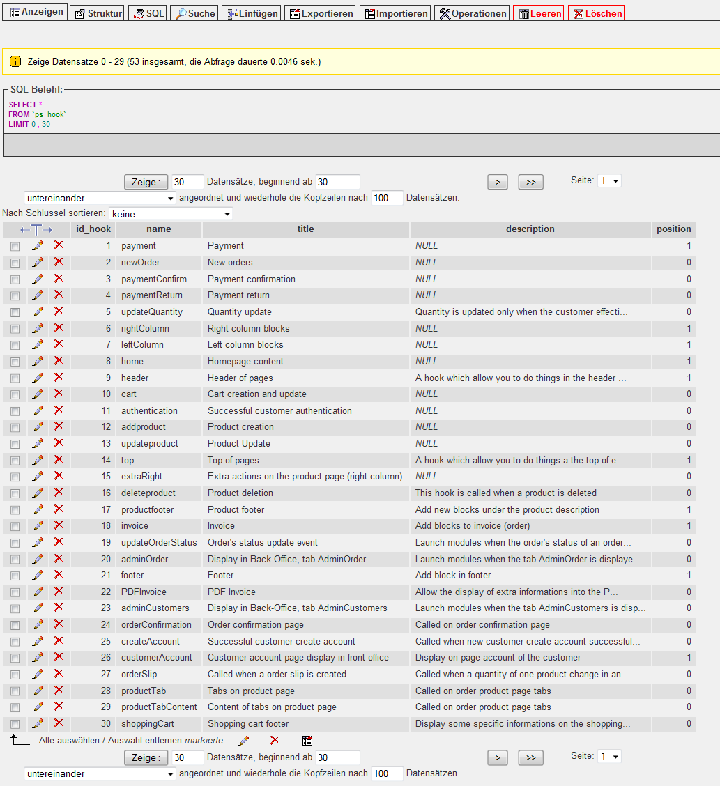 Schritt 1) Datenbank ps_hook-Tabelle anzeigen