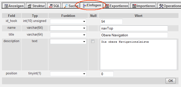 Um einen neuen Hook anzulegen, klicke oben im phpMyAdmin auf „Einfügen“, um eine neue Zeile einzufügen.