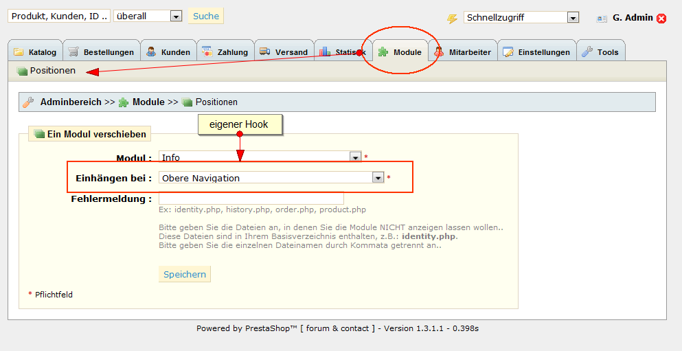 Schritt 6) PrestaShop-Backend: Modul dem eigenen Hook zuweisen