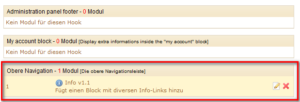 Der Hook wird nun mit dem zugeordneten Modul unter den anderen Poitionen angezeigt: