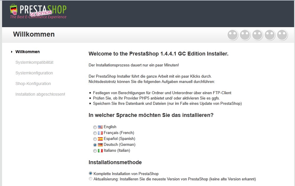 Die Installation erfolgt wie der normale PrestaShop auch. In 5 kurzen Schritten wird die Installationsroutine durchlaufen. Dabei werden die Datenbankparameter abgefragt und grundlegende Shopeinstellungen vorgenommen. Die wichtigsten Einstellungen sind voreingestellt. Für Deutschland wichtige Module sind vorausgewählt und bei der Installation werden typische CMS-Seiten wie Impressum, Datenschutzerklärung und Batterieverordnung mit Mustertexten gefüllt. Insbesonere auch das neue gesetzliche Muster der Widerrufsbelehrung für Warensendungen, das aufgrund der seit dem 04.08.2011 geltenden Regelungen zum Widerrufsrecht für alle Shopbetreiber offiziell empfohlen wird.